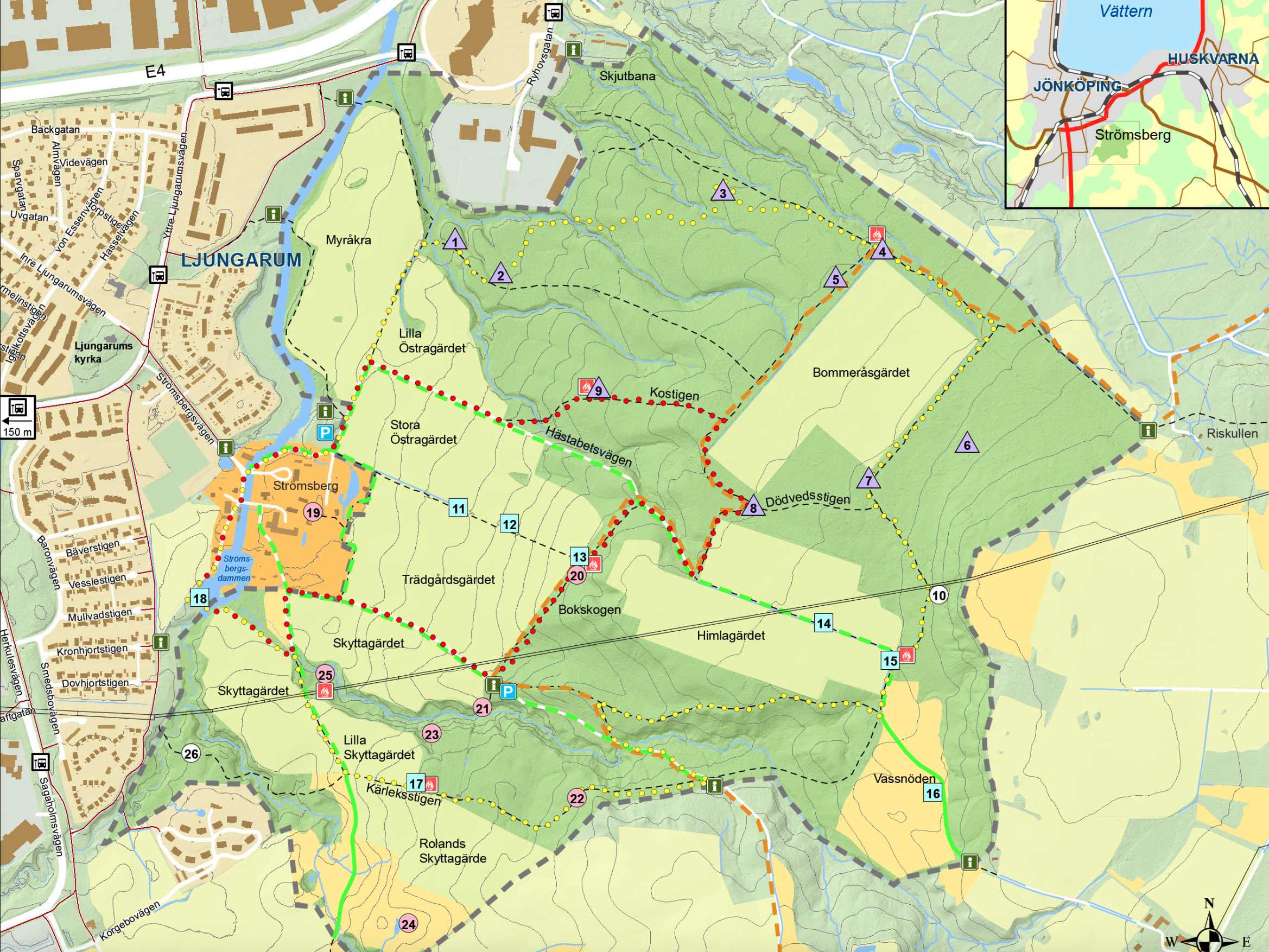 Strömsbergsföreningen vill ge besökare en fördjupad upplevelse av Strömsbergsskogen. Därför har vi valt ut 26 särskilt intressanta platser i området. Vid varje plats finns en informationsskylt som berättar mer om naturen, historien eller landskapet.